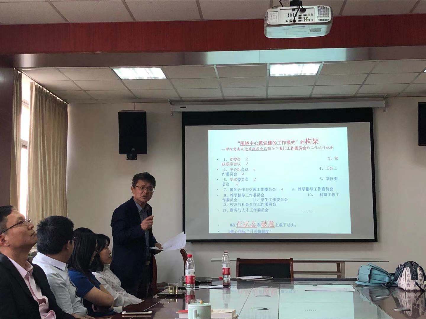 最后,管书记就近期公司党委书记胡金焱来学院开展调研的讲话精神阐述了学院围绕中心工作搞党建的工作思路。他结合学院博士点申报、一流团队建设、第五轮学科评估,对学院的现状进行了分析和评述。他说,学院的中心工作就是人才培养。人才培养也是高校基层党建工作最大的初心、最大的使命、最大的政治。要建立“围绕中心抓党建的工作模式”的构架--公司党委及党政联席会议领导下专门工作委员会的工作运行机制,在“在状态”和“破题”上狠下功夫;调动一切积极因素,为中心工作服务。要按照“三全育人”开展全员育人、全过程育人、全方位育人活动。通过这次“不忘初心、牢记使命”主题教育,凝心聚力,团结合作,为学校和学院事业发展作出应有的贡献。