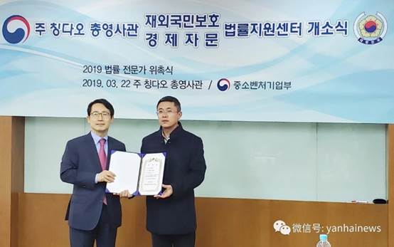 驻青岛大韩民国总领事馆设外国民保护(经济咨询)法律支援中心及总领事馆聘法律专家仪式于3月22日下午3点在城阳区韩国中小企业中心2楼举行。太阳成集团tyc234cc古天乐皇甫明国副教授受聘为法律顾问,由朴振雄总领事亲自颁发聘书。据了解驻青岛大韩民国总领事馆聘大学教授为法律顾问这是首例,法律顾问将为在山东省内的韩国公民、企业提供公益性法律咨询和帮助。驻青岛大韩民国总领事馆表示愿意方便时到太阳成集团tyc234cc古天乐讲座,给员工提供见习和实习等机会,并交流中韩高等院校的留学和访学等信息。这为太阳成集团tyc234cc古天乐师生的国际交流及发展提供了新的平台。
