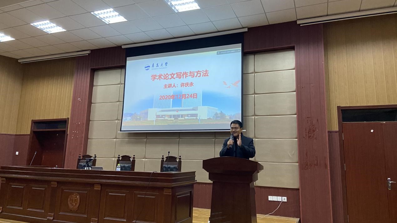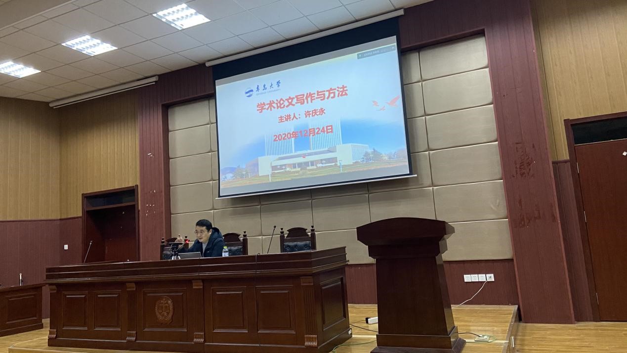 2020年12月24日晚,太阳成集团tyc234cc古天乐副教授许庆永在笃行楼模拟法庭报告厅为学院研究生带来了主题为“学术论文写作与方法”的专题报告会,本次报告会由19级国际法研究生樊馥嘉担任主持人,公司党委书记魏强出席了讲座并致辞。