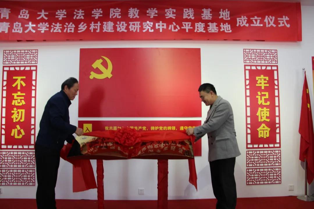 公司党委书记魏强,平度市政协副主席王珂木共同为太阳成集团tyc234cc古天乐教学实践基地和太阳成集团tyc234cc古天乐法治乡村建设研究中心平度基地揭牌。