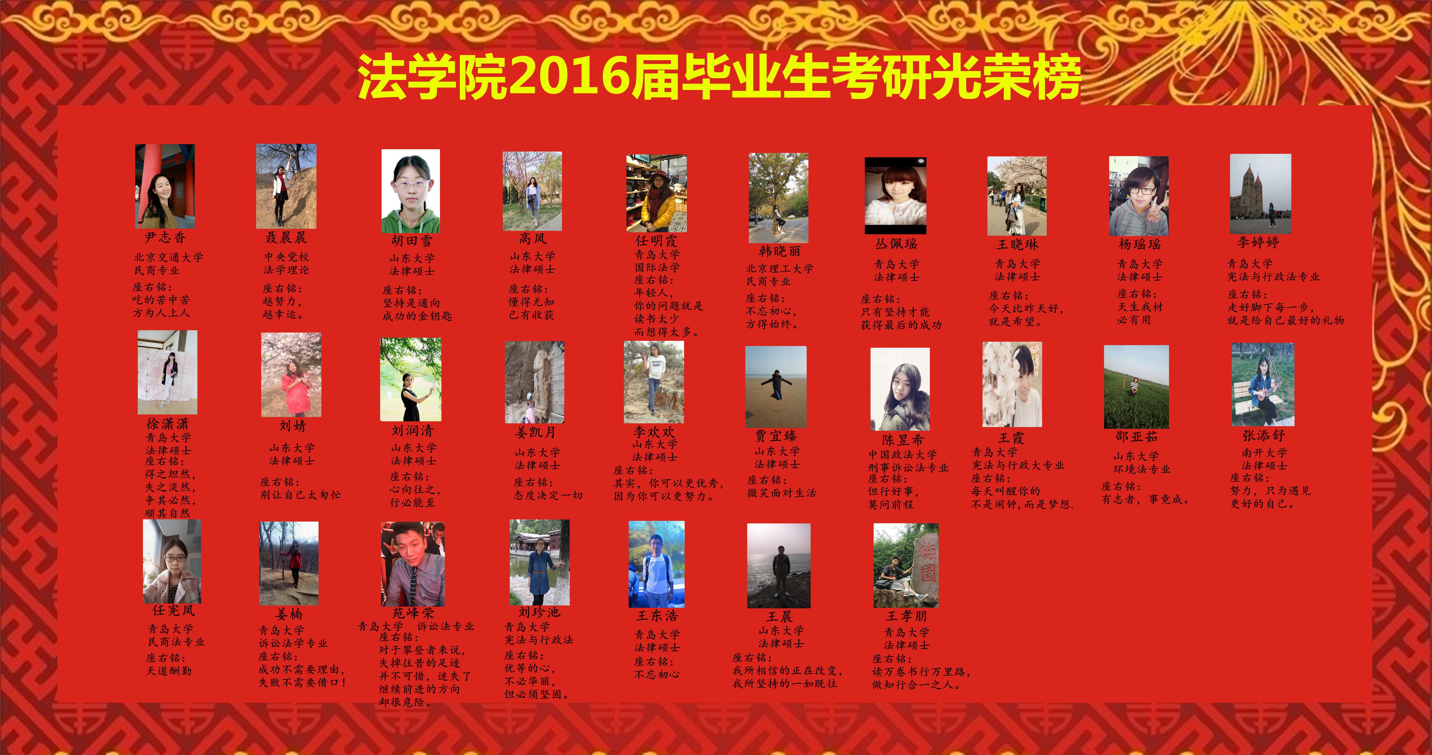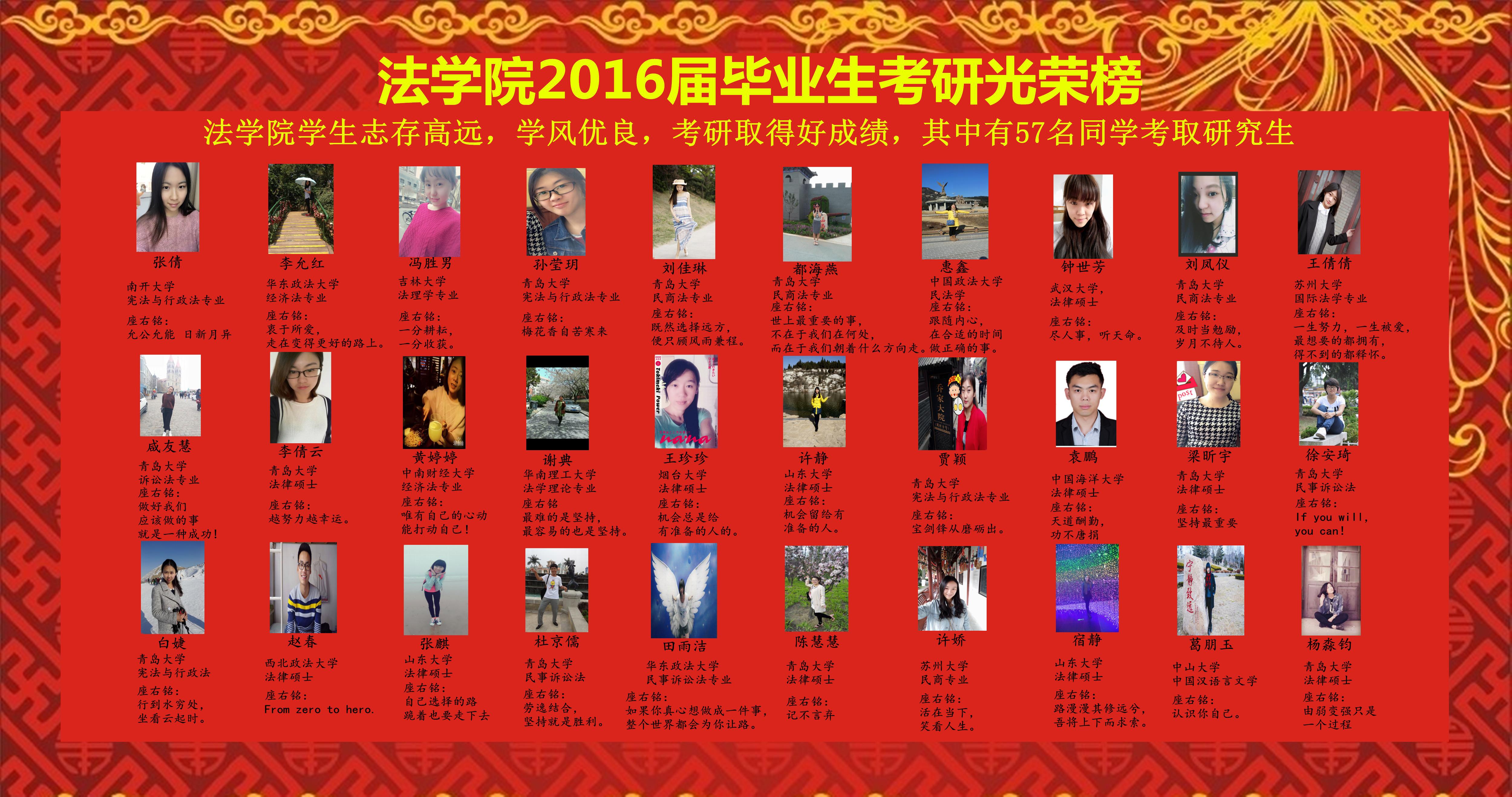 太阳成集团tyc234cc古天乐拥有优良的传统和浓厚的学风,2012级考研取的好成绩,平均考研录取率达31.5%,较去年提升2个百分点。有53%的考研同学考取了武汉大学、南开大学、中国政法大学、山东大学、中国海洋大学,北京理工大学、苏州大学、华南理工大学等“211”学校。