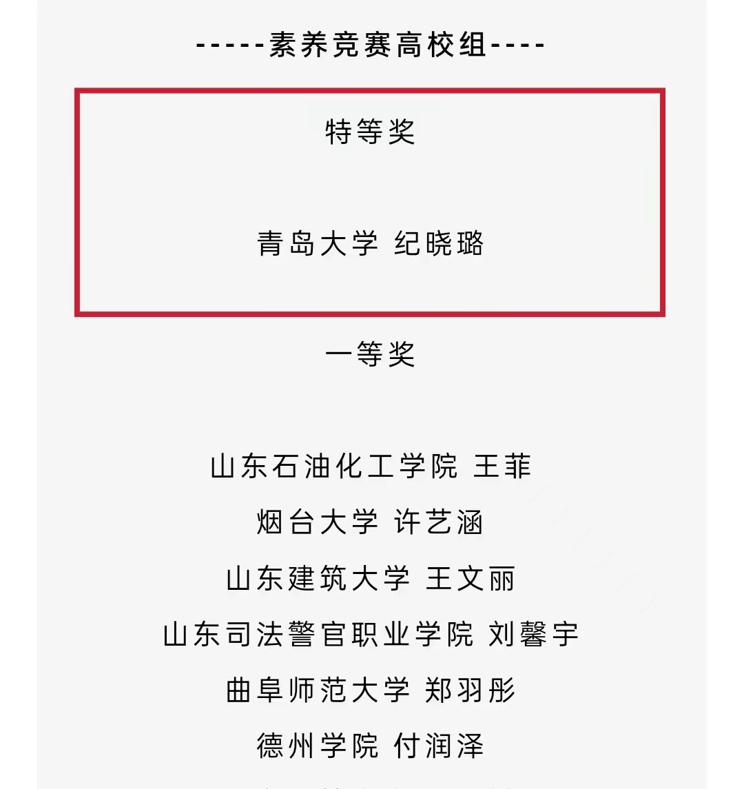 纪晓璐以严谨的态度,认真作答每一个题目,在第二轮多段式抢答环节中与竞争对手们逐渐拉开了差距。辛勤的学习和汗水不会辜负任何一个努力的人,充足的准备工作最终在舞台上绽放出绚丽的光彩。纪晓璐最终以65分的优异成绩完成了这次比赛,荣获山东省特等奖,摘得素养竞赛高校组的桂冠!